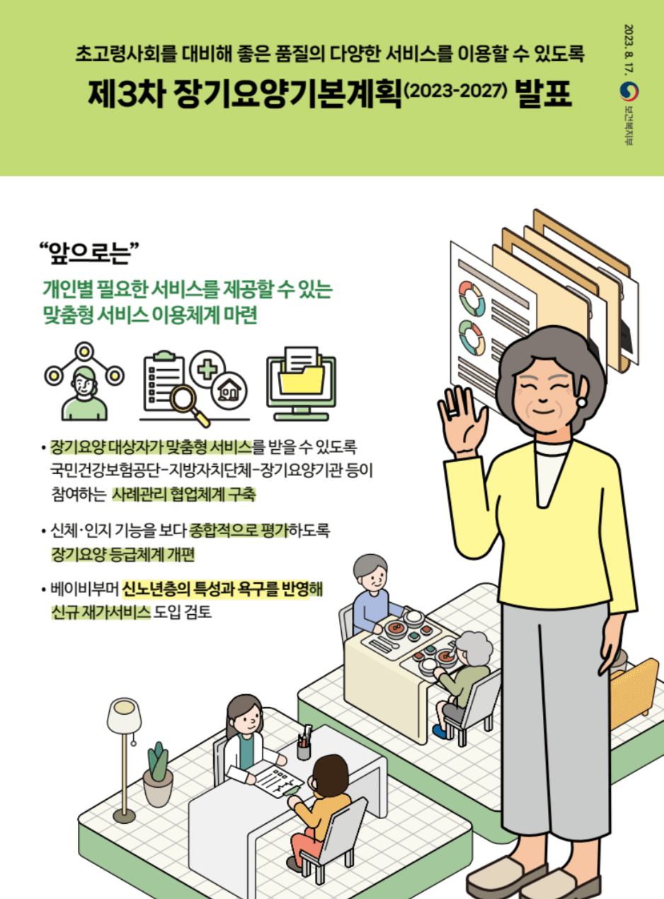 ▶️ 집에서도 돌봄과 의료 서비스를 받을 수 있게 장기요양서비스 강화