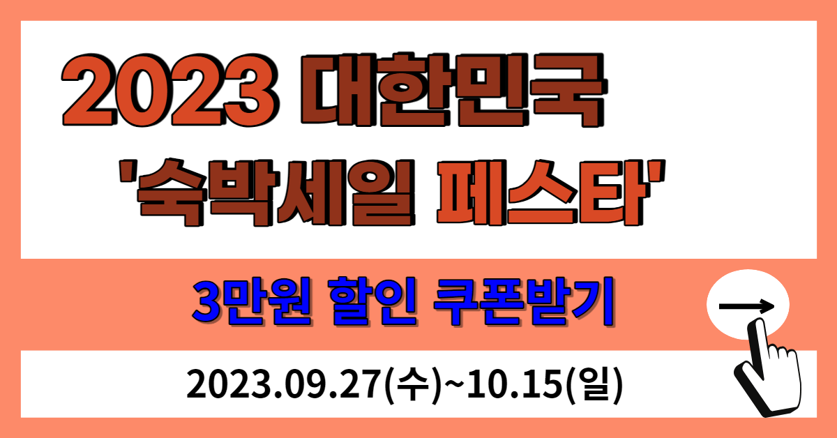 숙박시설을 이용하는 사람에게는 현금 등 3만 원의 혜택이 주어지는데요, 이를 통해 숙박업체의 수익도 늘어나겠지만, 이는 세금으로 지원되는 현금성 숙박쿠폰이기 때문에 이 정보를 잘 알고 잘 활용하면 혜택을 보실 수 있겠습니다. 이벤트는 1인당 1매 선착순으로 제공되며, 수량 소진 시 조기 종료됩니다. 자세한 내용은 한국관광공사 대한민국구석구석 홈페이지 내에 '2023 대한민국 숙박세일 페스타'에서 확인하실 수 있으며 발행 및 이용 기간은 9월 27일부터 10월 15일까지 약 2주간입니다.